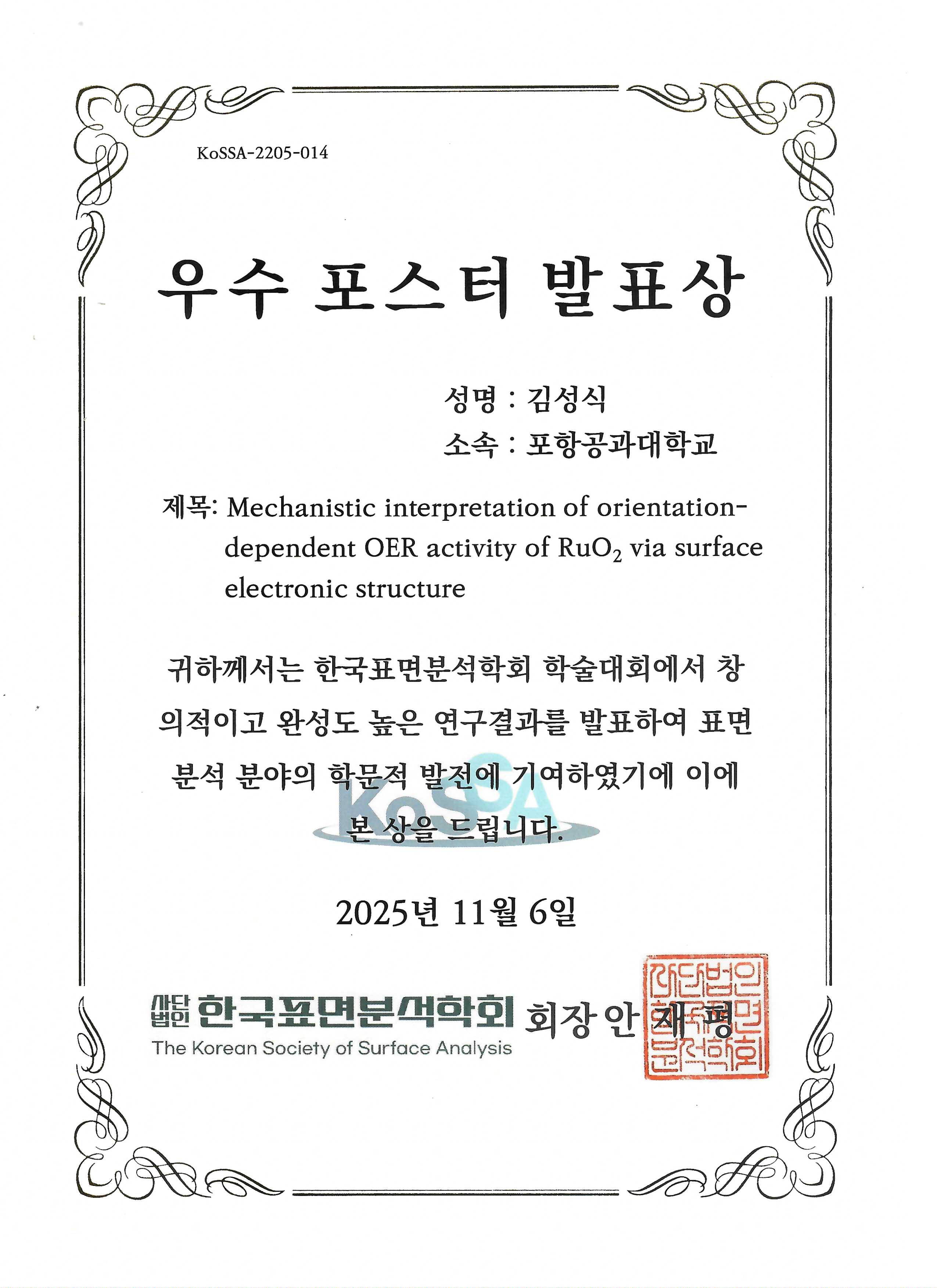 The 2025 Korean Society of Surface Analysis -Seong-Sik Kim, Gahee Noh, Owen Ericksen, Yurim Hong, In-Su Lee, Chang-Beom Eom and Si-Young Choi- -Best Poster Award -"Mechanistic interpretation of orientation-dependent OER activity of RuO2 via surface electronic structure" -2025. 11. 05 - 07 / KW convention center, Daejeon, Republic of Korea