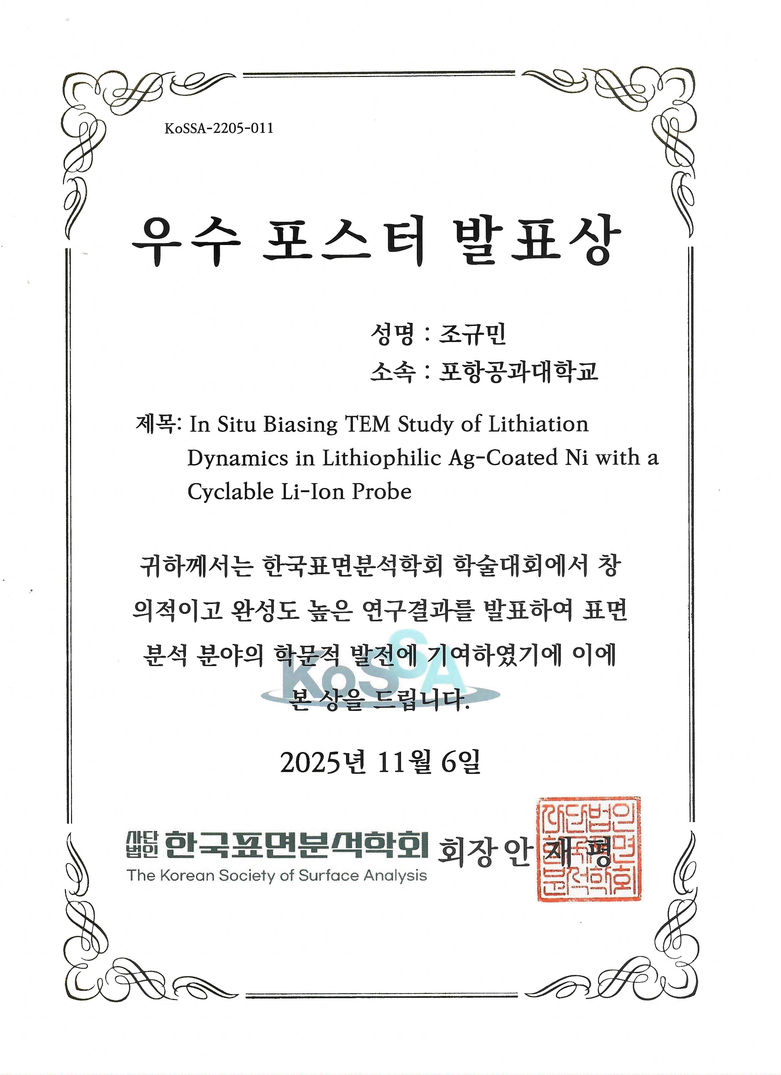 The 2025 Korean Society of Surface Analysis -Kyu-Min Jo, Yu-Jeong Yang, Abin Kim, Chunggi Jung, Byoungwoo Kang and Si-Young Choi- -Best Poster Award -"In Situ Biasing TEM Study of Lithiation Dynamics in Lithiophilic Ag-Coated Ni with a Cyclable Li-Ion Probe" -2025. 11. 05 - 07 / KW convention center, Daejeon, Republic of Korea