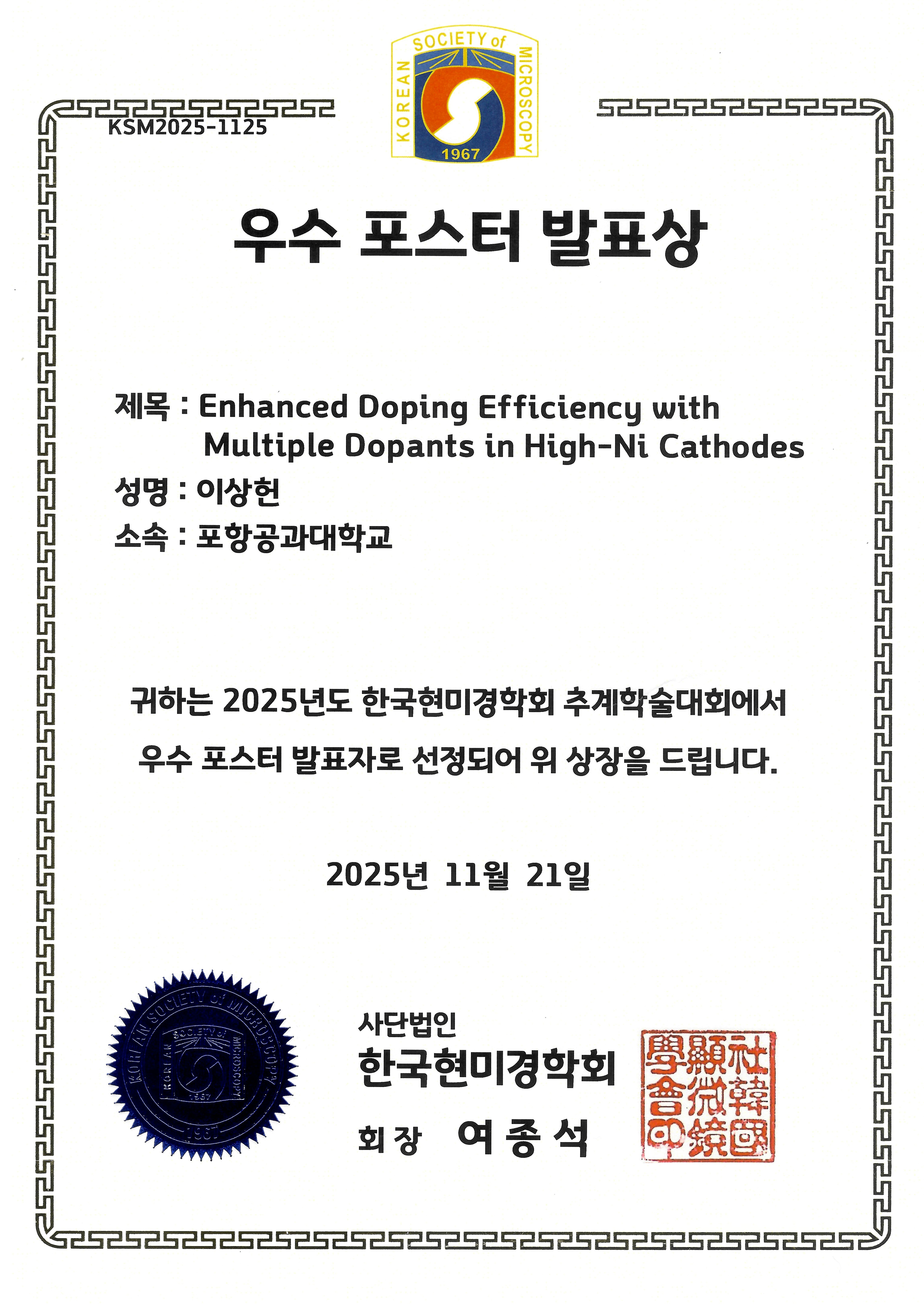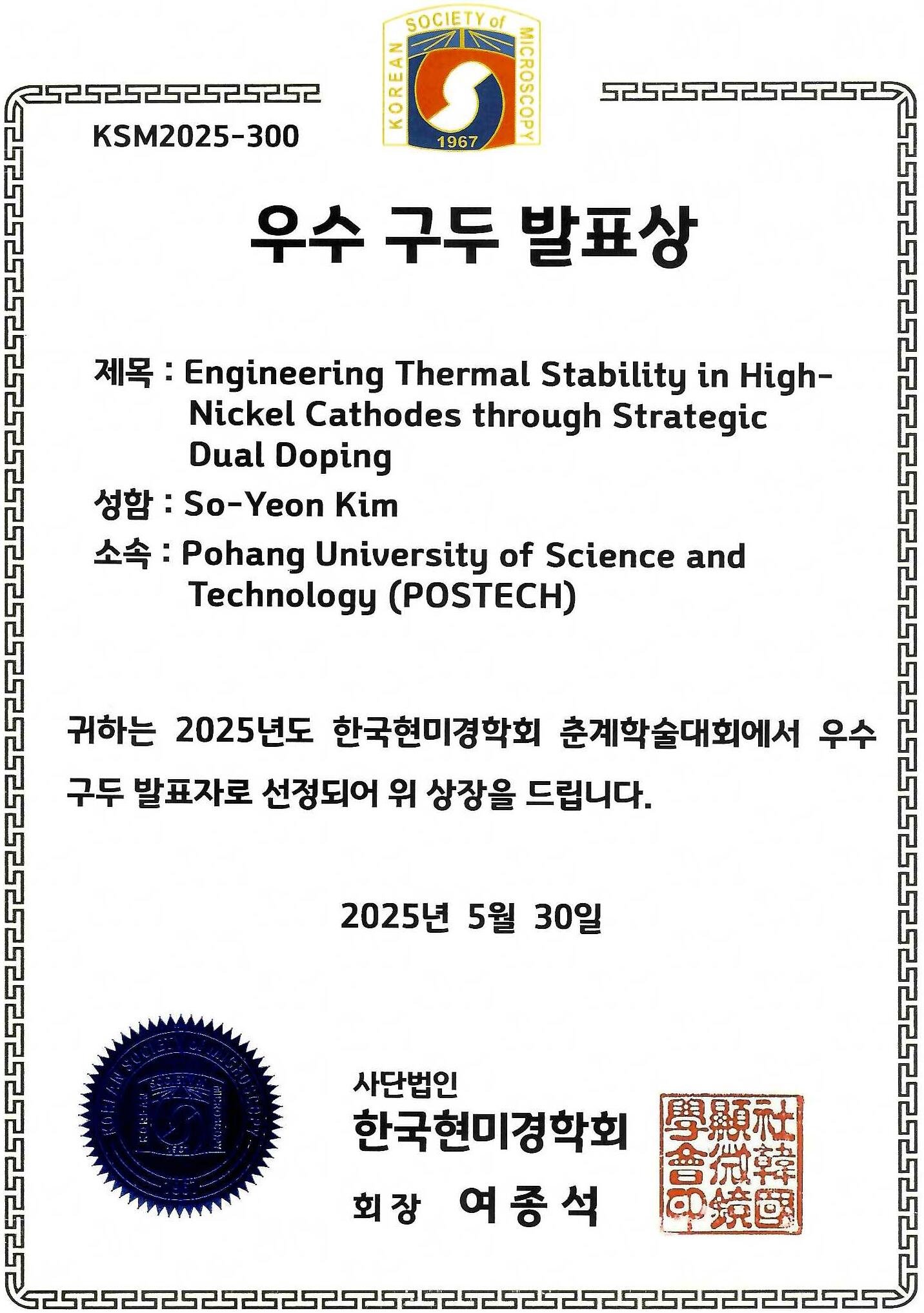 - Best Presentation Award - "Engineering Thermal Stability in High-Nickel Cathodes through Strategic Dual Doping" - 2025. 05. 30 Spring Conference hosted by The Korean Society of Microscopy