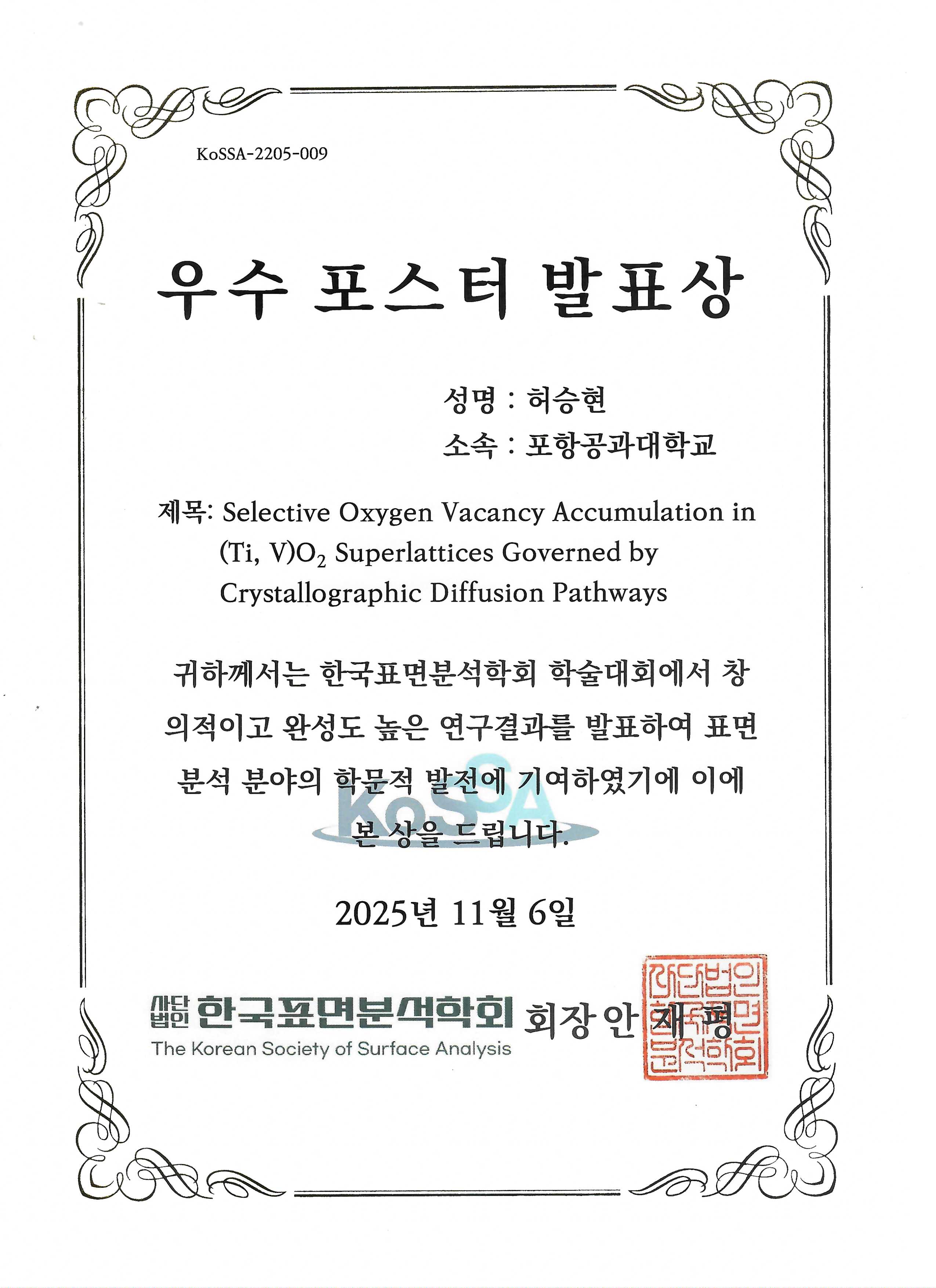 The 2025 Korean Society of Surface Analysis -Seung-Hyun Heo, Hyeji Sim, Gyung-Min Park, Gi-Yeop Kim, Jaeseoung Park, Junwoo Son and Si-Young Choi- -Best Poster Award -"Selective Oxygen Vacancy Accumulation in (Ti,V)O2 Superlattices Governed by Crystallographic Diffusion Pathways" -2025. 11. 05 - 07 / KW convention center, Daejeon, Republic of Korea