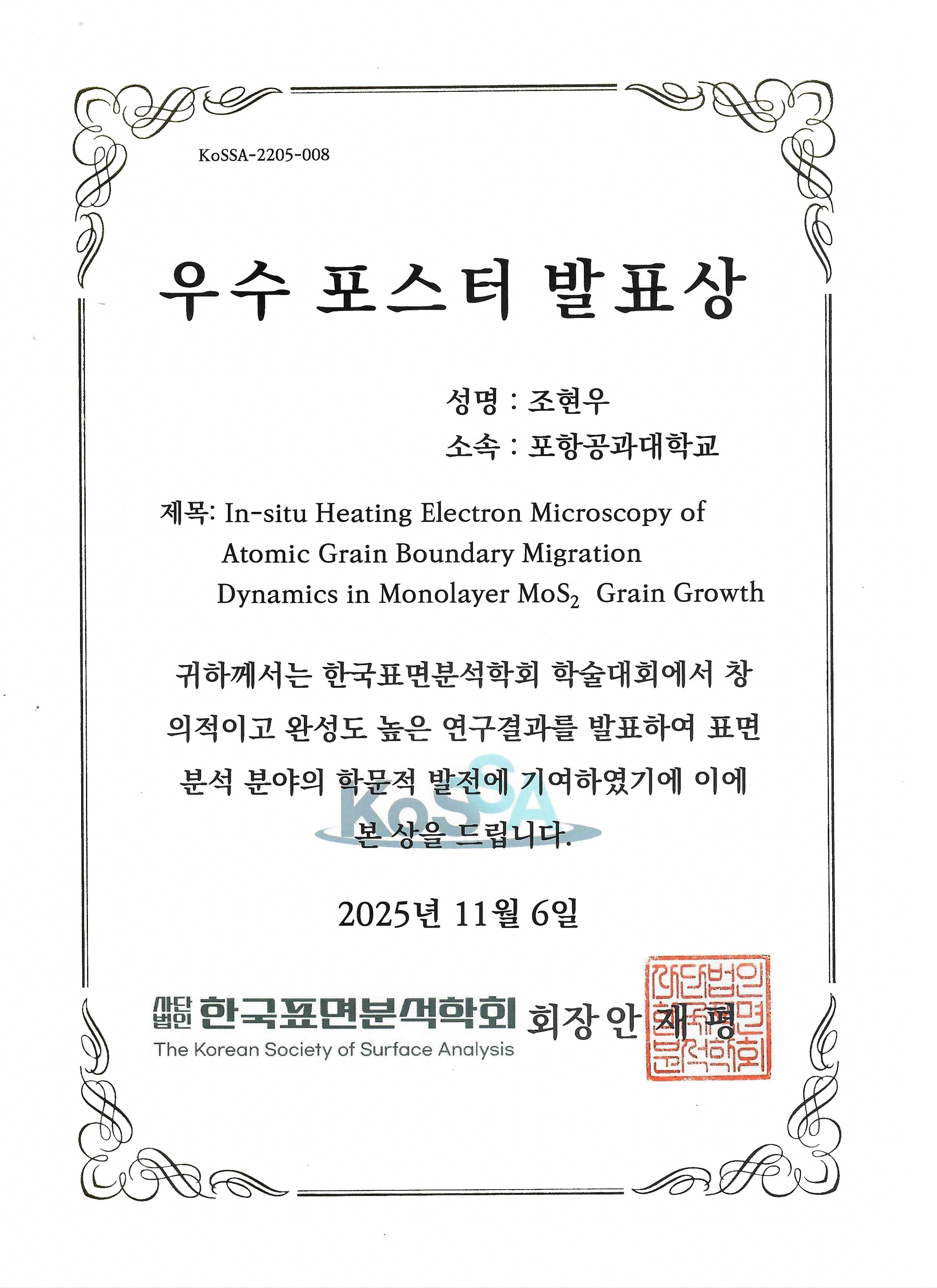 The 2025 Korean Society of Surface Analysis -Chang-Won Choi, Min-Yeong Choi, Jinho Rhee, Hyeon-Woo Cho, Seokho Moon, Jong Kyu Kim, Jungwon Park, Cheol-Joo Kim and Si-Young Choi- -Best Poster Award -"In-situ Heating Electron Microscopy of Atomic Grain Boundary Migration Dynamics in Monolayer MoS2 Grain Growth" -2025. 11. 05 - 07 / KW convention center, Daejeon, Republic of Korea