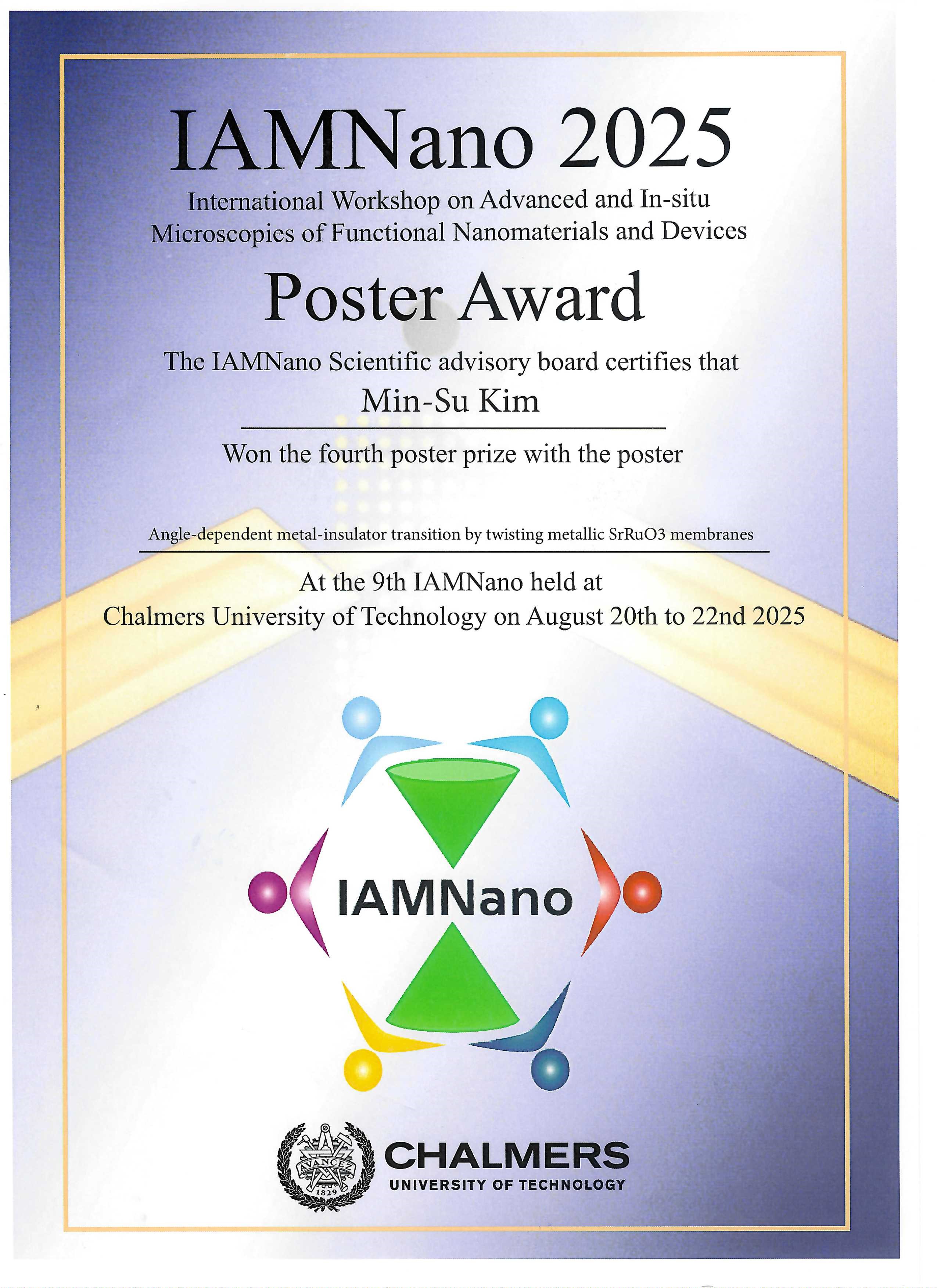 - Best Poster Award - "Angle-dependent metal-insulator transition by twisting metallic SrRuO3 membranes" - 2025. 09. 20 - 22 / Chalmers University of Technology, Gothenburg, Sweden